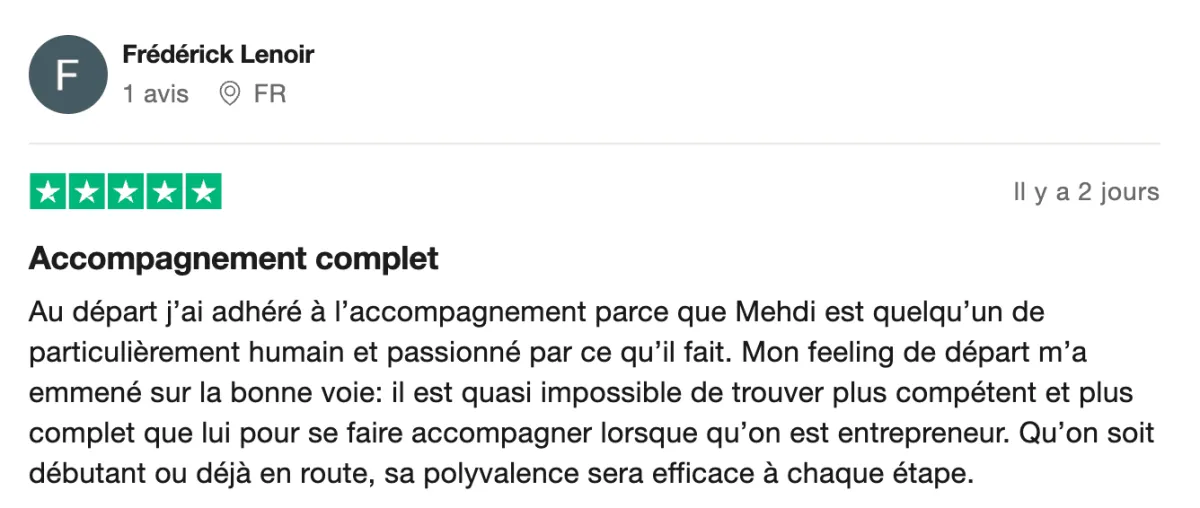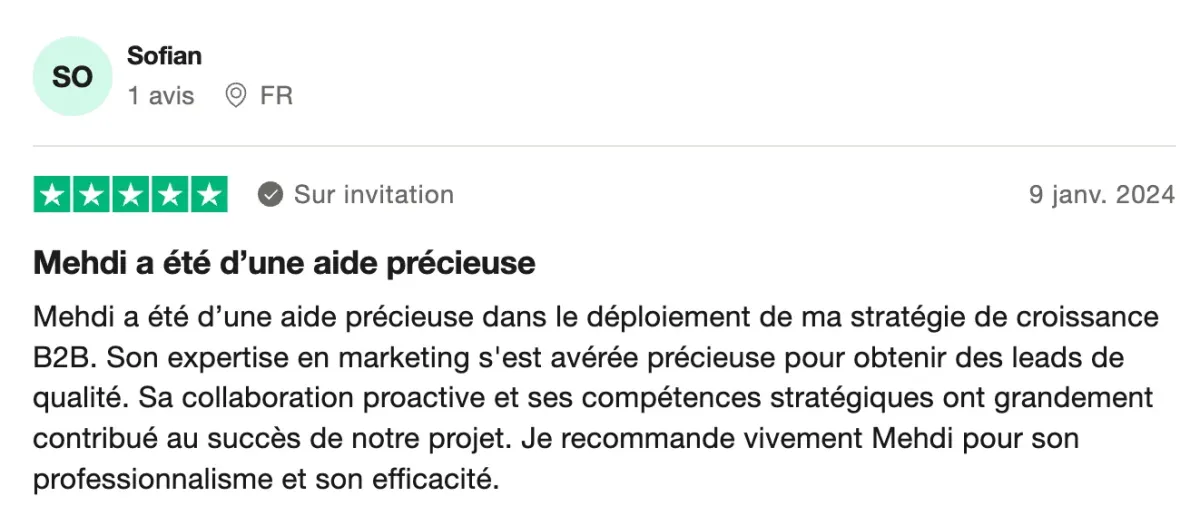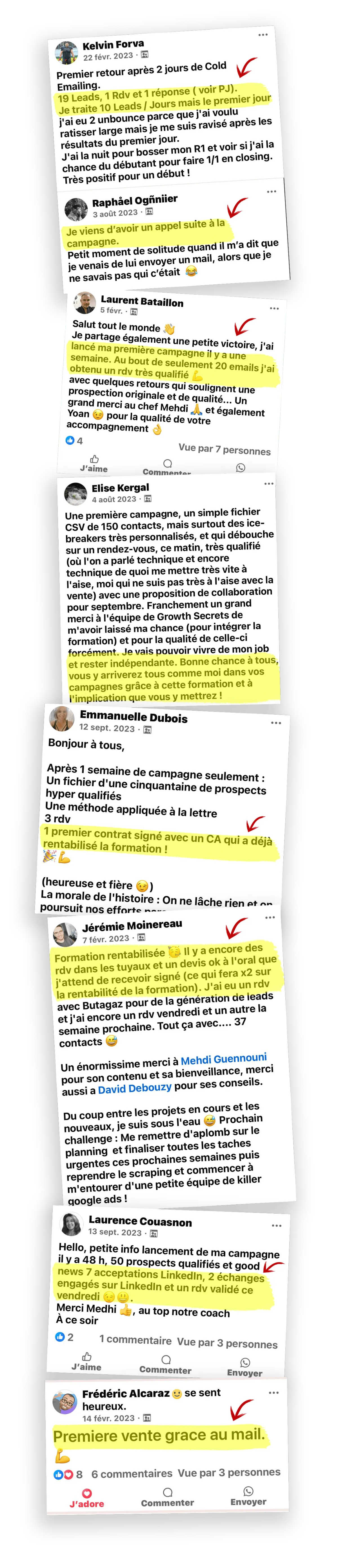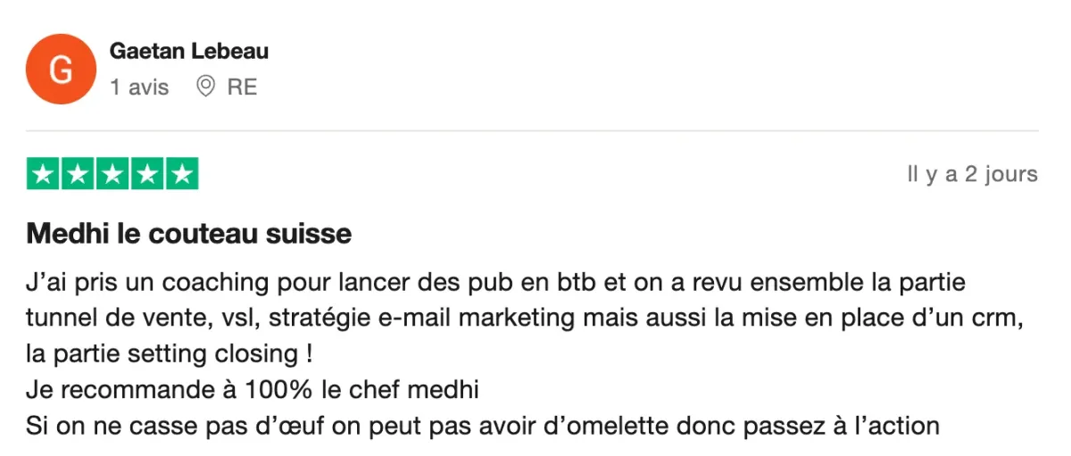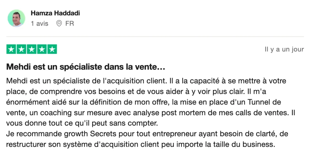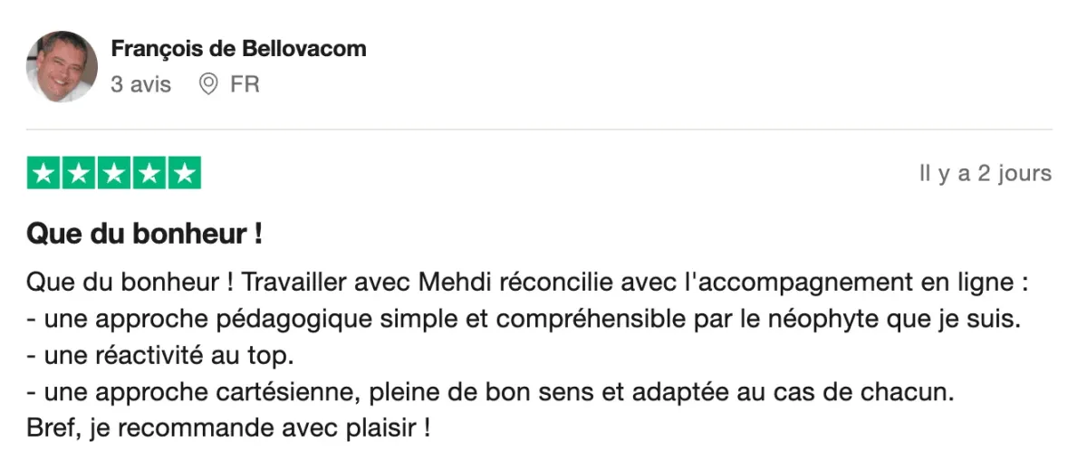 Si, malgré une mise en application sérieuse, vous n’obtenez aucun résultat, je vous rembourse intégralement ET je vous offre un coaching privé de 30 minutes avec l'un de nos consultants pour auditer votre compte et identifier ce qui bloque.